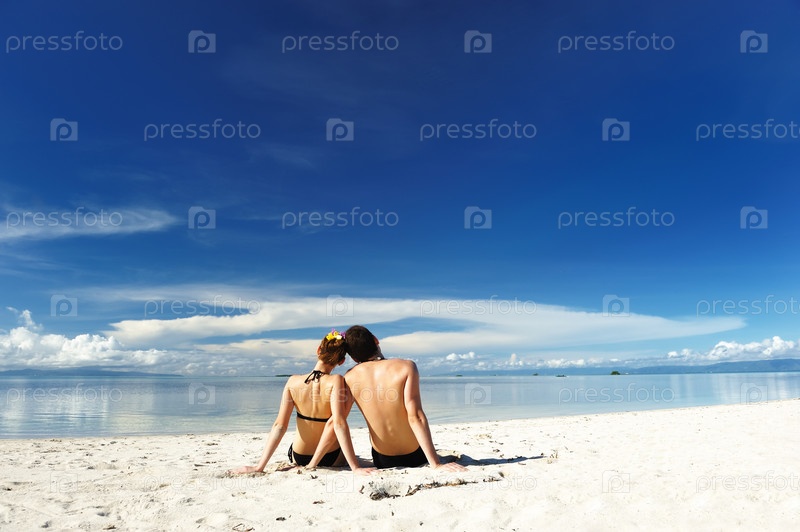 Молодая пара сидит на песчаном пляже тропического острова, Филиппины