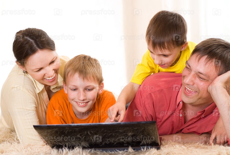 Счастливые родители с детьми на ковре проводят совместное время у компьютера