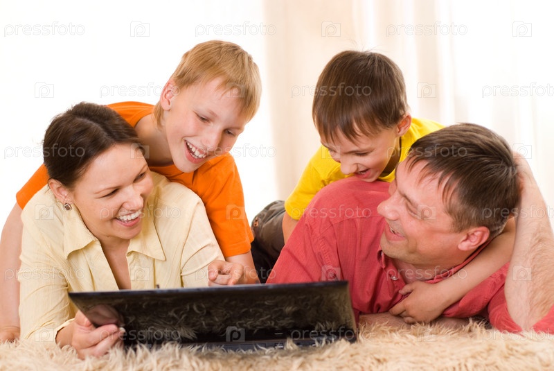 Портрет счастливой семьи на ковре с ноутбуком