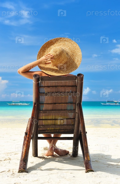 Девушка в шляпе сидит в деревянном кресле на пляже тропического острова, Филиппины