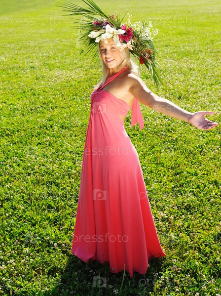 Девушка в цветочном венке стоит на траве
