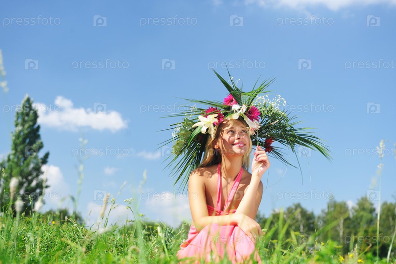 Девушка в цветочном венке сидит на траве