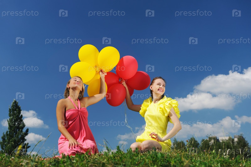Девушки с воздушными шарами сидят на траве