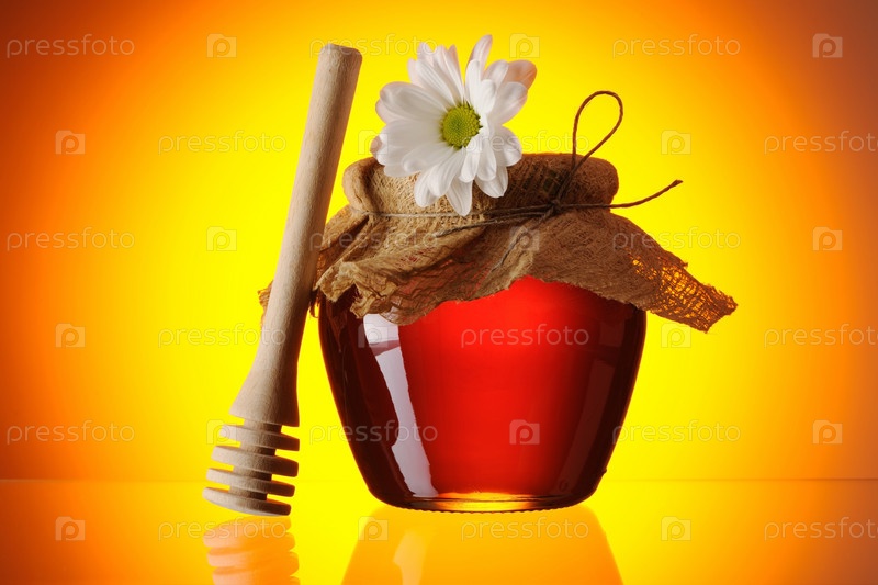 Баночка меда с цветком и деревянный черпак на желтом фоне