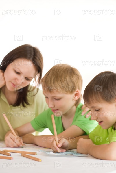 Молодая мама с сыновьями, рисующие за столом на белом фоне