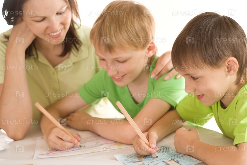 Молодая мама с сыновьями, рисующие за столом на белом фоне