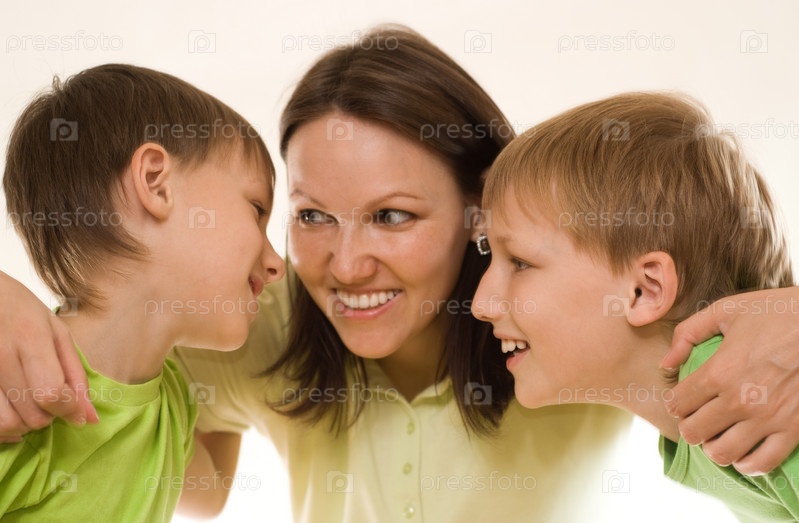 Молодая счастливая мама с сыновьями на белом фоне