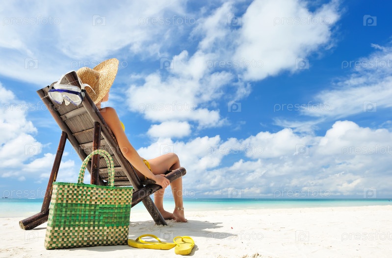 Молодая девушка, сидящая на тропическом пляже
