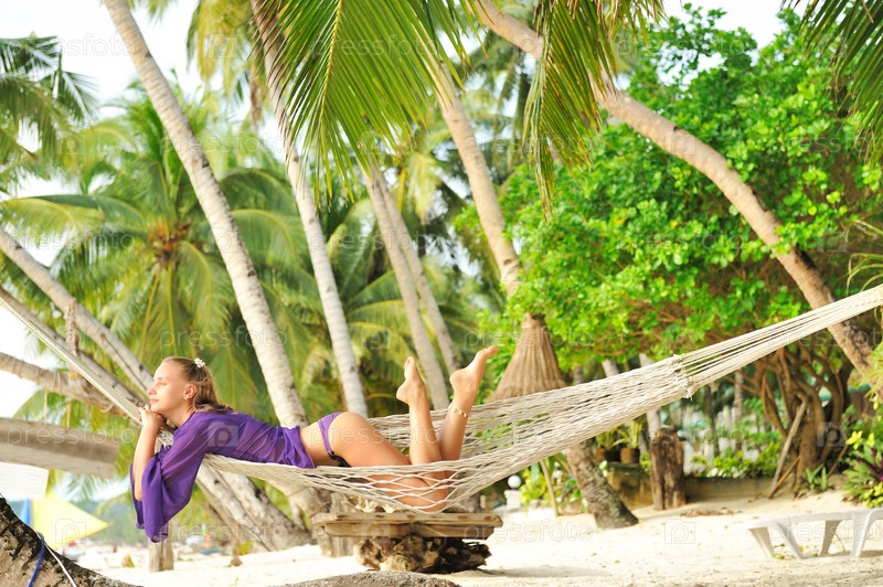 Молодая девушка, лежащая в гамаке на тропическом пляже
