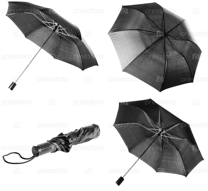 Черный зонт с разных ракурсов, изолированный на белом фоне
