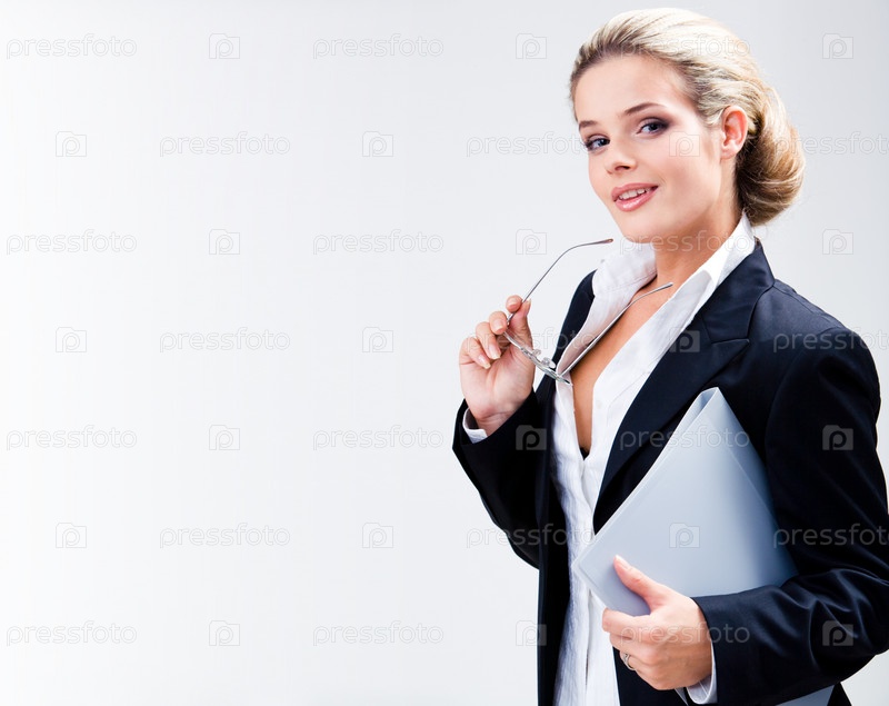Портрет красивой учительницы, держащей очки и папку на белом фоне