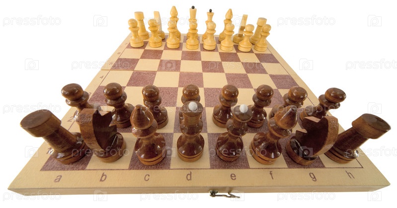 Деревянные шахматисты на доске на белом
