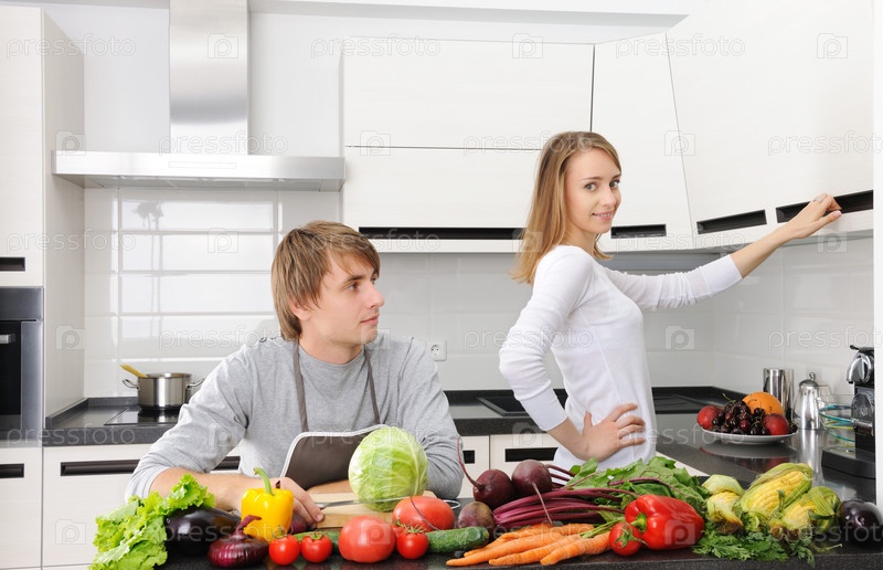 Молодая пара, занимающаяся приготовлением пищи в современной кухне