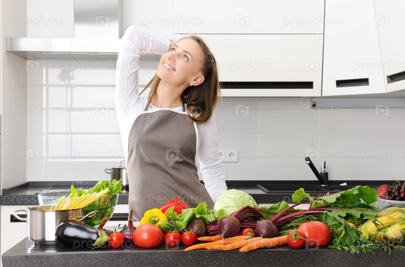 Молодая девушка, занимающаяся приготовлением пищи в современной кухне