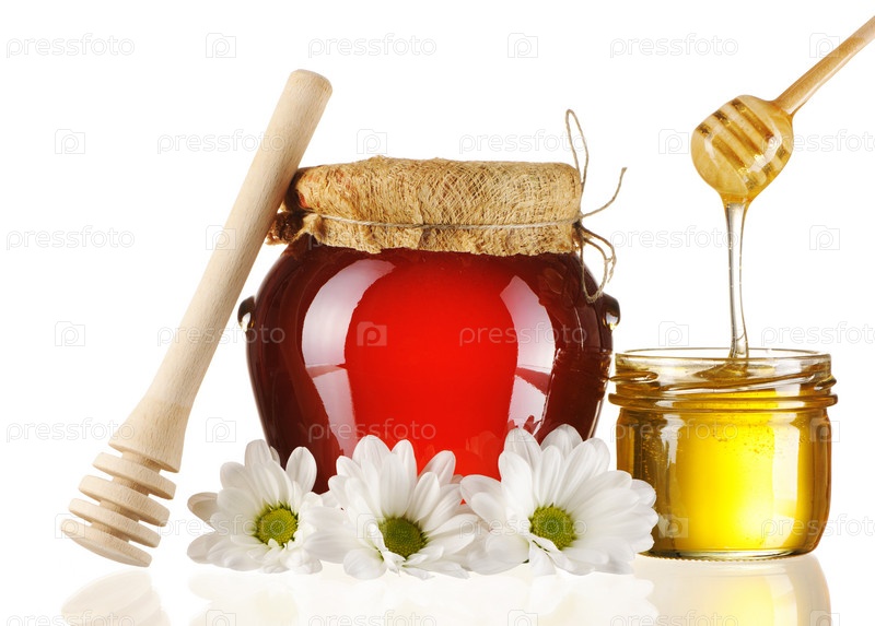 Кувшинчик и банка с медом на белом фоне