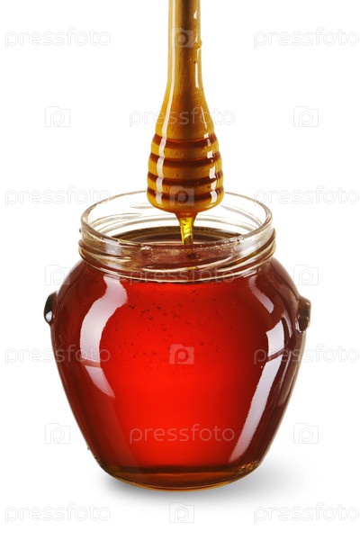 Кувшинчик с медом на белом фоне
