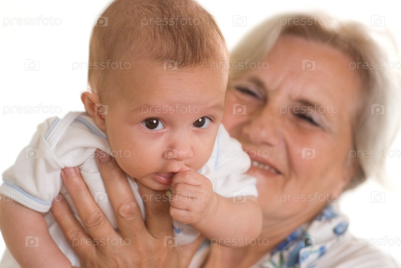 Пожилая женщина с младенцем в руках на белом фоне