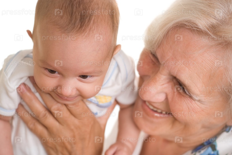 Пожилая женщина с младенцем в руках на белом фоне