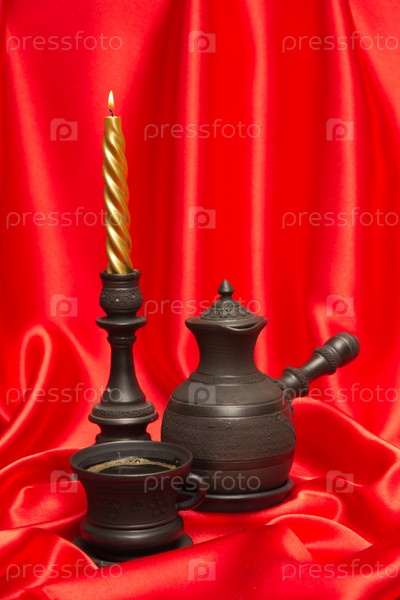 Кофейный набор на красном шелковом фоне