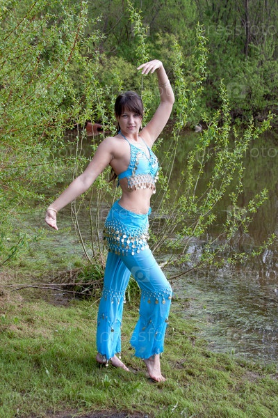 Девушка танцует восточный танец на берегу озера
