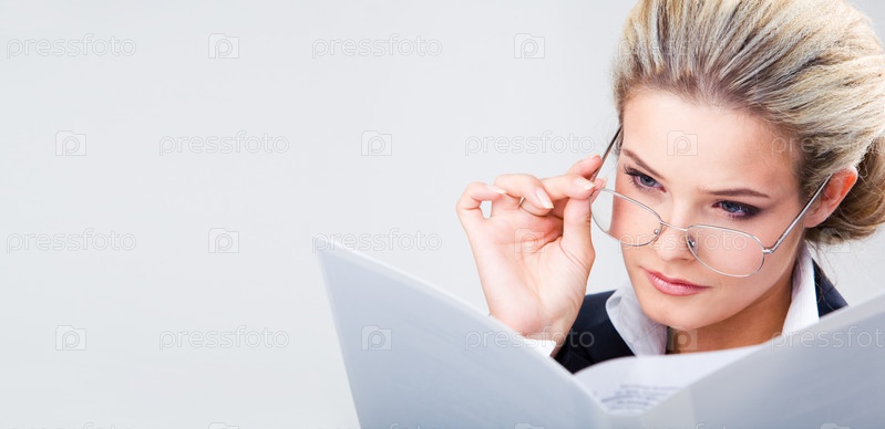 Фото уверенной бизнес-леди, которая носит очки и серьезно смотрит на план