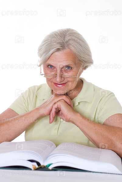 Пожилая женщина в очках с книгой