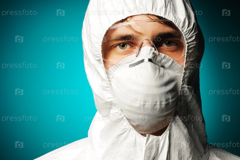 Ученый в защитной одежде, очках и Респираторе