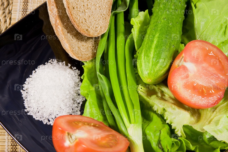 Помидоры, хлеб, соль, огурец и зелень в тарелке