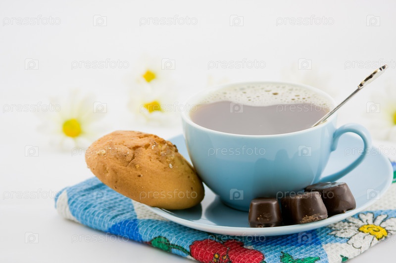 Чашка горячего кофе с печеньем и конфетами крупным планом