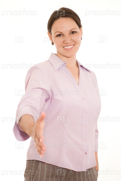 Красивая молодая женщина протягивает руку для приветствия на белом фоне