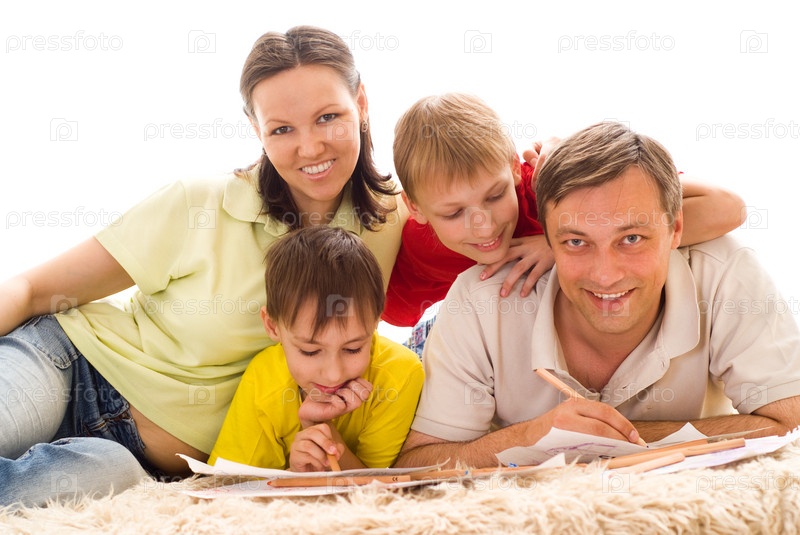 Счастливая семья лежит на ковре и рисует