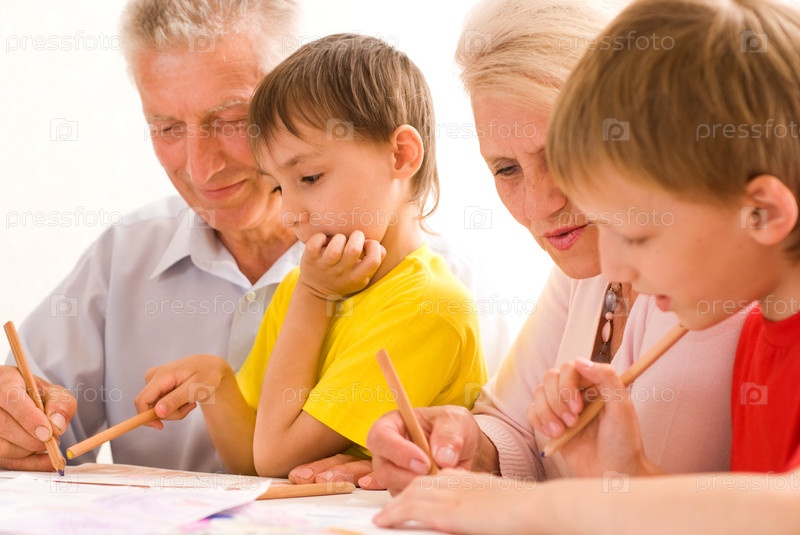 Бабушка и дедушка рисуют со своими внуками
