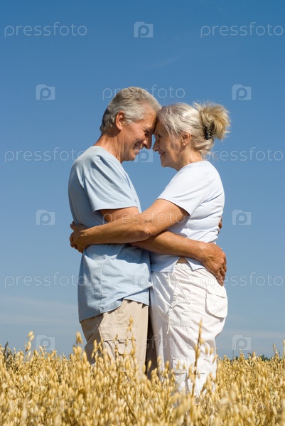 Счастливая пожилая пара в поле