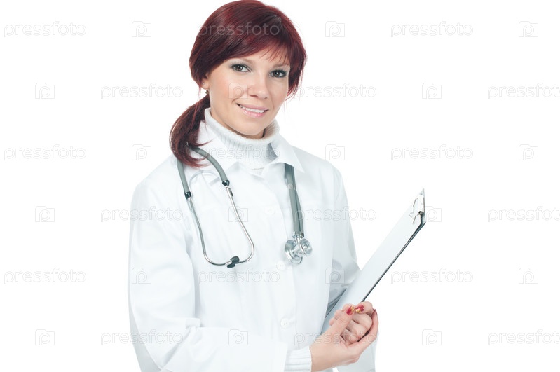Улыбающаяся женщина-врач в медицинском халате со стетоскопом, изолированная на белом фоне
