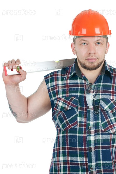 Уверенный строитель в защитной каске с уровнем в руках на белом фоне