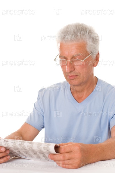 Деловой пожилой мужчина читает газету на белом фоне
