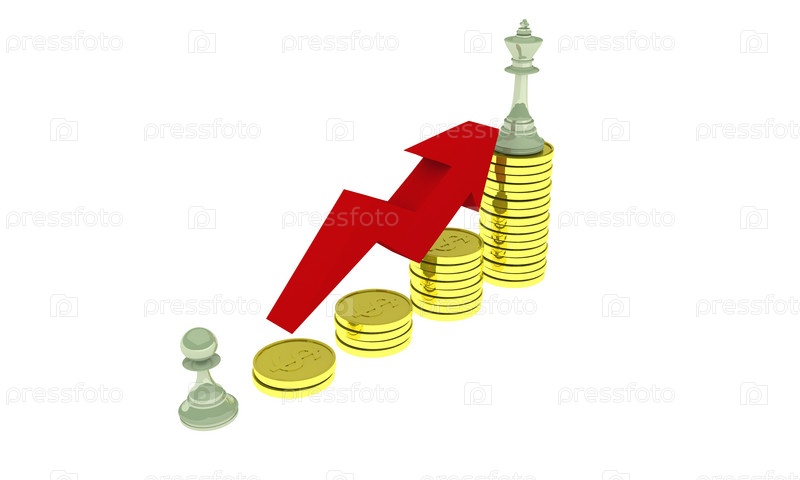 Диаграмма роста из золотых монет с шахматными фигурами и красной стрелкой