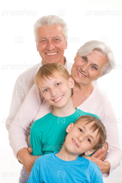 Счастливая пожилая пара с внуками на белом фоне
