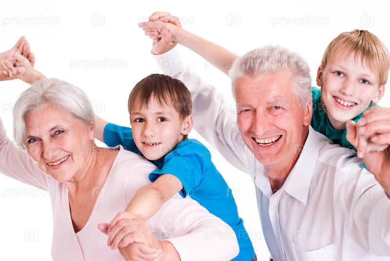 Счастливая пожилая пара с внуками на белом фоне