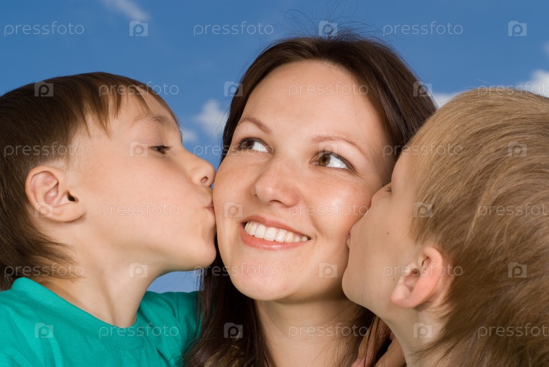Счастливая мать с двумя сыновьями на фоне неба