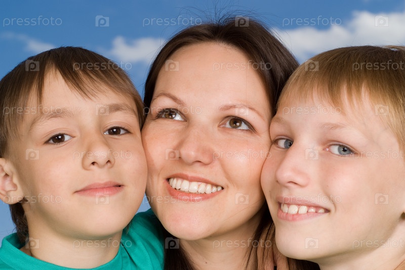 Счастливая мать с двумя сыновьями на фоне неба