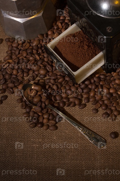 Ложка, ручная кофемолка и кофейные зерна на ткани