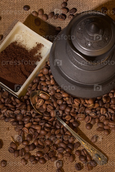 Ложка, ящик от ручной кофемолки, кофейник и зерна на ткани