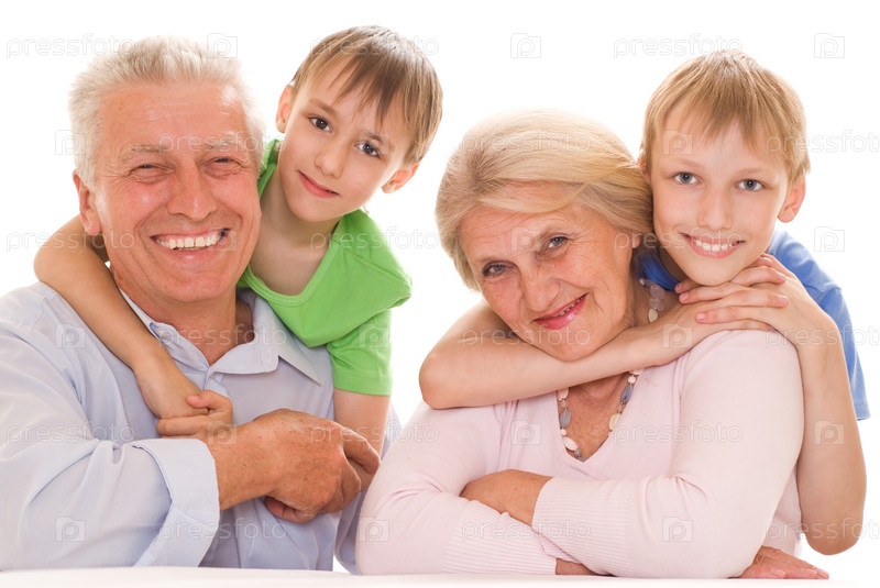 Счастливые бабушка с дедушкой проводят время с внуками