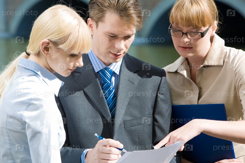 Портрет дружественной деловой команды, смотрящей на документ в человеке
