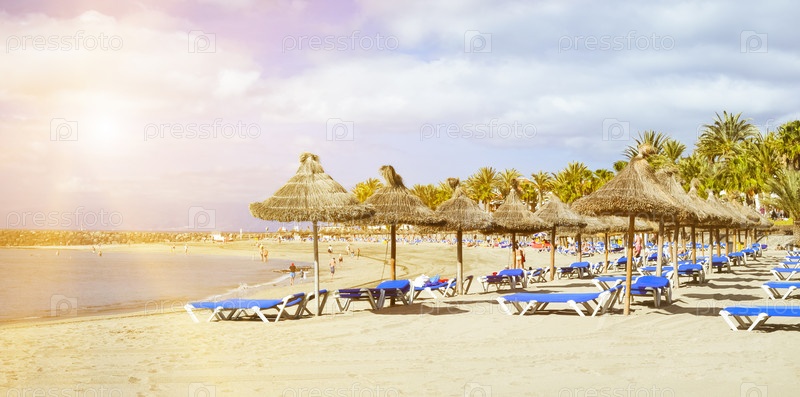 Соломенные зонтики и шезлонги на Плайя де Лас Америкас, Тенерифе