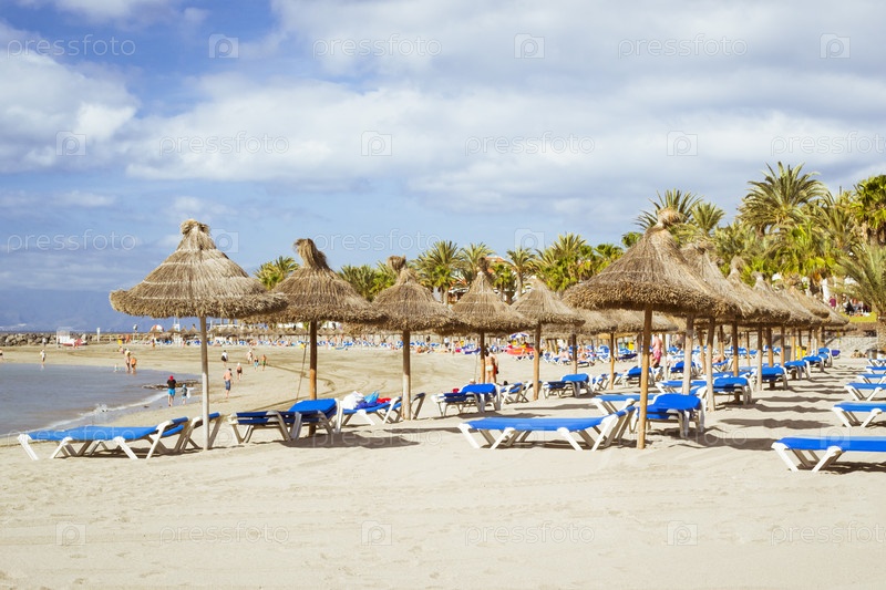 Соломенные зонтики и шезлонги на Плайя де Лас Америкас, Тенерифе
