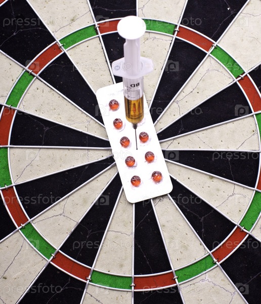 Шприц с лекарством и упаковка таблеток в центре доски для дартса