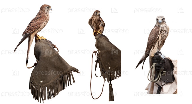 Три сокола на руках сокольничих, изолированные на белом фоне