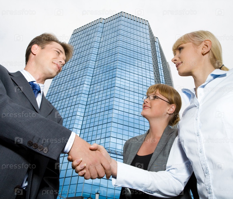 Изображение бизнесмена, пожавшего руку уверенной женщине с другой женщиной, стоящей рядом